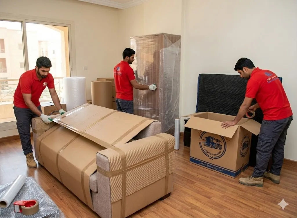 فريقنا يقوم بتغليف العفش وفك الأثاث بعناية فائقة
